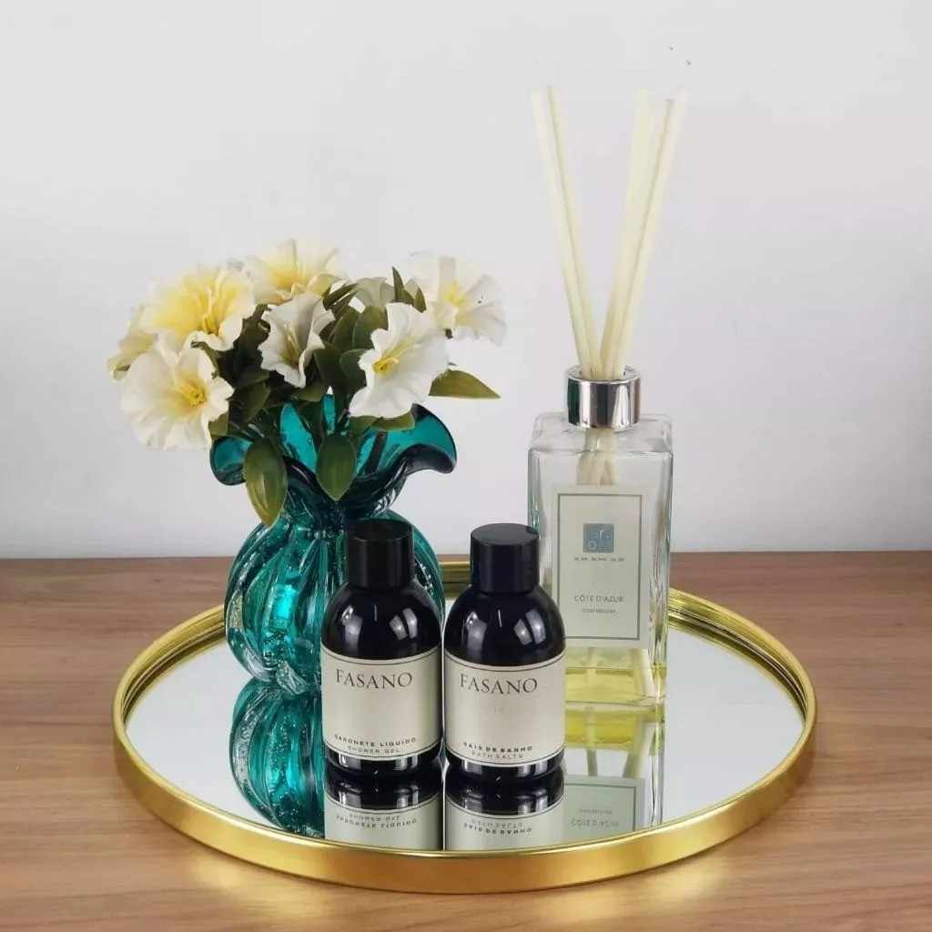 Essa bandeja espelhada é muito mais do que apenas uma peça decorativa; ela é uma adição funcional e versátil ao seu lar. Coloque-a na sala de estar para exibir velas e arranjos florais, no quarto para organizar perfumes e joias ou até mesmo no banheiro para acomodar seus produtos de beleza com estilo.
